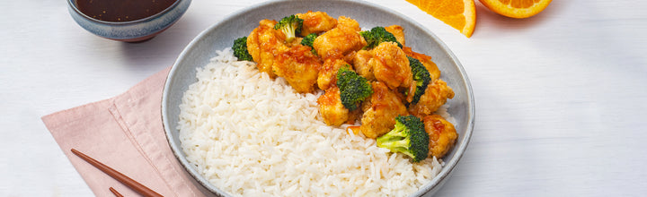 Plate your rice, Kevin's Orange Chicken, and broccoli.