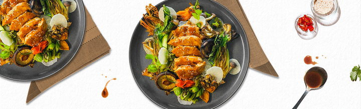 Who doesn't love juicy teriyaki chicken over a bed of noodles? We sure do. What we don't love is all the sugar that tends to come with it nowadays. Our take on a classic teriyaki bowl begins with cleaning the recipe up to make it keto and paleo friendly. We've replaced wheat and egg noodles with Shirataki noodles made from yam flour and added 3 common ingredients that make this a nutritious, antioxidant powerhouse! Mushrooms and Bok Choy are packed with selenium - a mineral that detoxifies, combats inflammation, and may lower cancer risk. The daikon radish not only tastes great but is packed with Vitamin C, potassium, and phytonutrients. We don't call this one a Power Plate for nothin'!