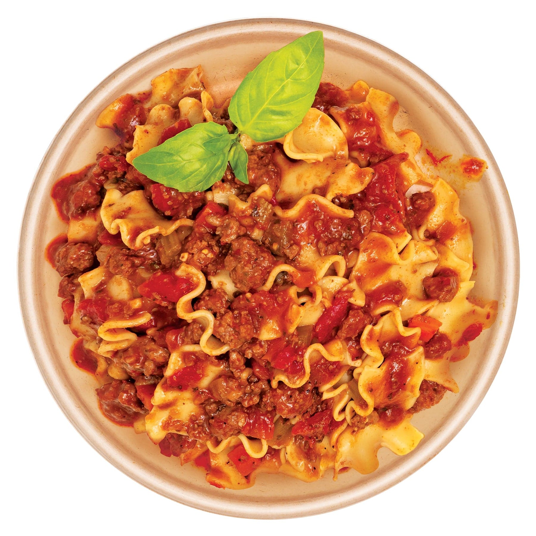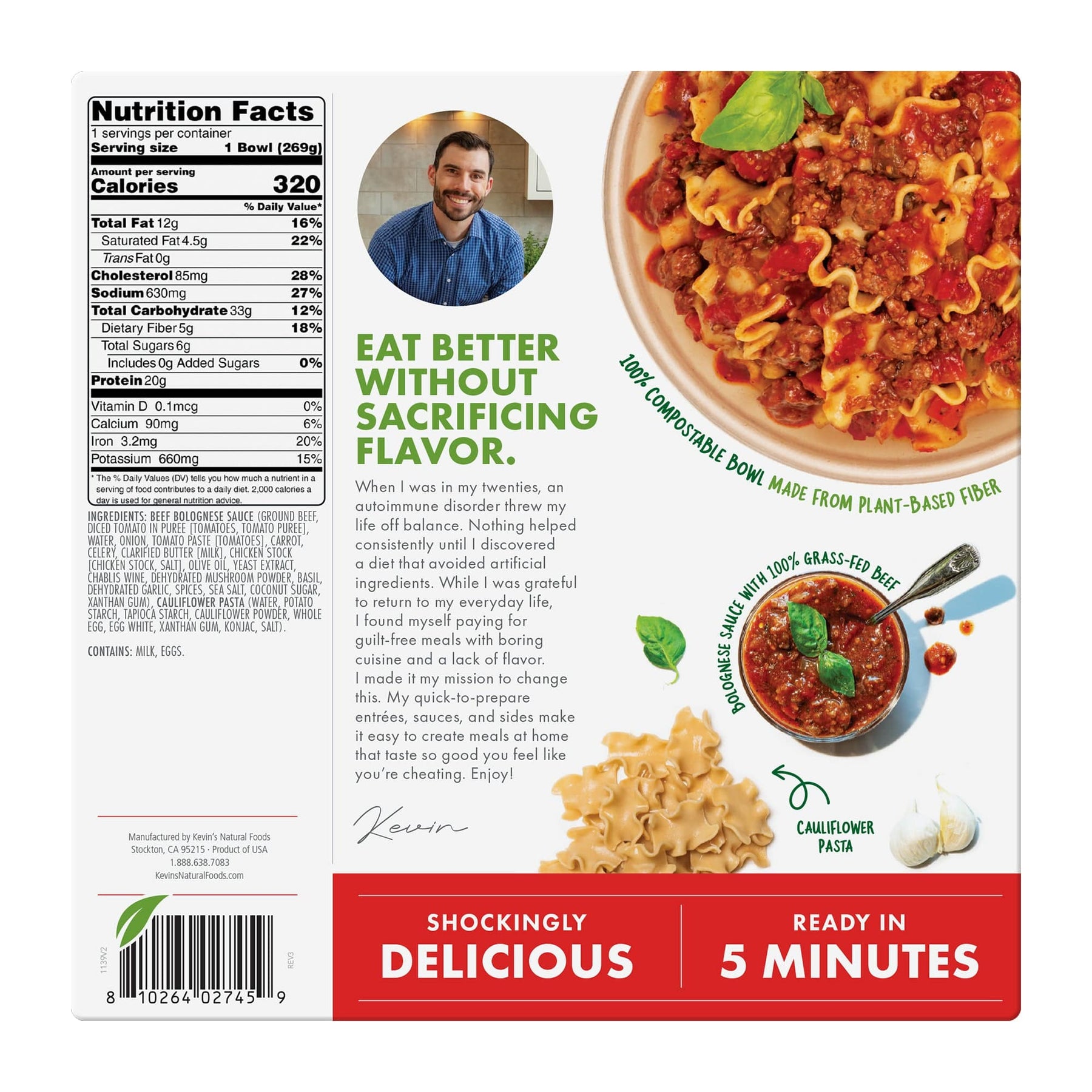 Beef Bolognese Sauce (Ground Beef, Diced Tomato In Puree [Tomatoes, Tomato Puree], Water, Onion, Tomato Paste [Tomatoes], Carrot, Celery, Clarified Butter [Milk], Chicken Stock [Chicken Stock, Salt], Olive Oil, Chablis Wine, Yeast Extract, Dehydrated Mushroom Powder, Basil, Dehydrated Garlic, Spices, Sea Salt, Coconut Sugar, Xanthan Gum), Cauliflower Pasta (Water, Potato Starch, Tapioca Starch, Cauliflower Powder, Whole Egg, Egg White, Xanthan Gum, Konjac, Salt).
