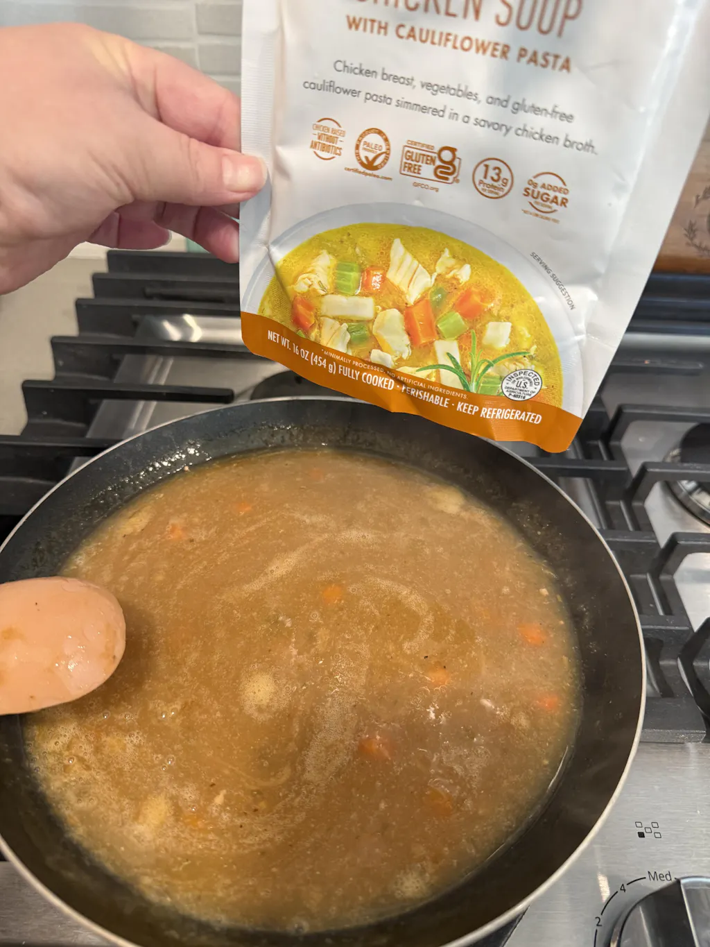 Water, Chicken (Boneless Skinless Chicken Breast, Water, Vinegar, Yeast Extract, Sea Salt, Cultured Onion Juice, Black Pepper, Citrus Extract), Cauliflower Pasta (Water, Potato Starch, Tapioca Starch, Cauliflower Powder, Whole Egg, Egg White, Xanthan Gum, Konjac, Salt), Carrots, Celery, Onion, Chicken Stock (Chicken Stock, Salt), Chicken Fat (Water, Chicken, Carrots, Rosemary Extract), Tapioca Starch, Yeast Extract, Chicken Stock Concentrate (Chicken Stock, Salt, Natural Flavor, Yeast Extract, Sugar, Chicken Fat), Dried Chicken Broth, Cultured Onion Juice, Xanthan Gum, Parsley, Spices.