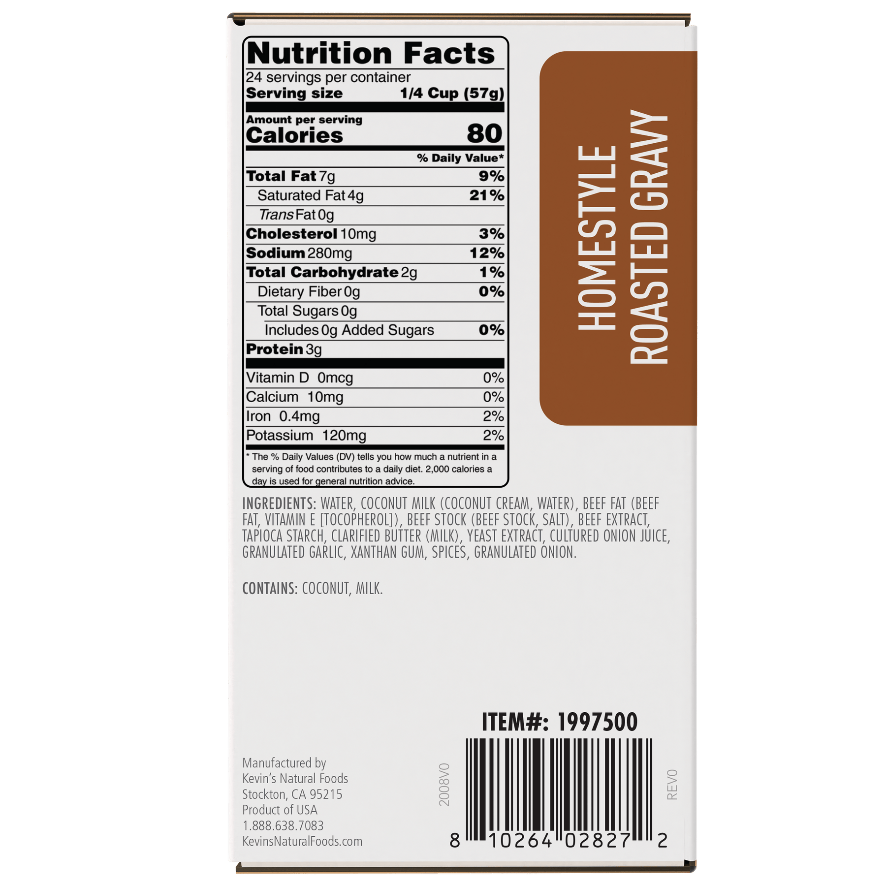 Water, Coconut Milk (Coconut Cream, Water), Beef Fat (Beef Fat, Vitamin E [Tocopherol]), Beef Stock (Beef Stock, Salt), Beef Extract, Tapioca Starch, Clarified Butter (Milk), Yeast Extract, Cultured Onion Juice, Granulated Garlic, Xanthan Gum, Spices, Granulated Onion.